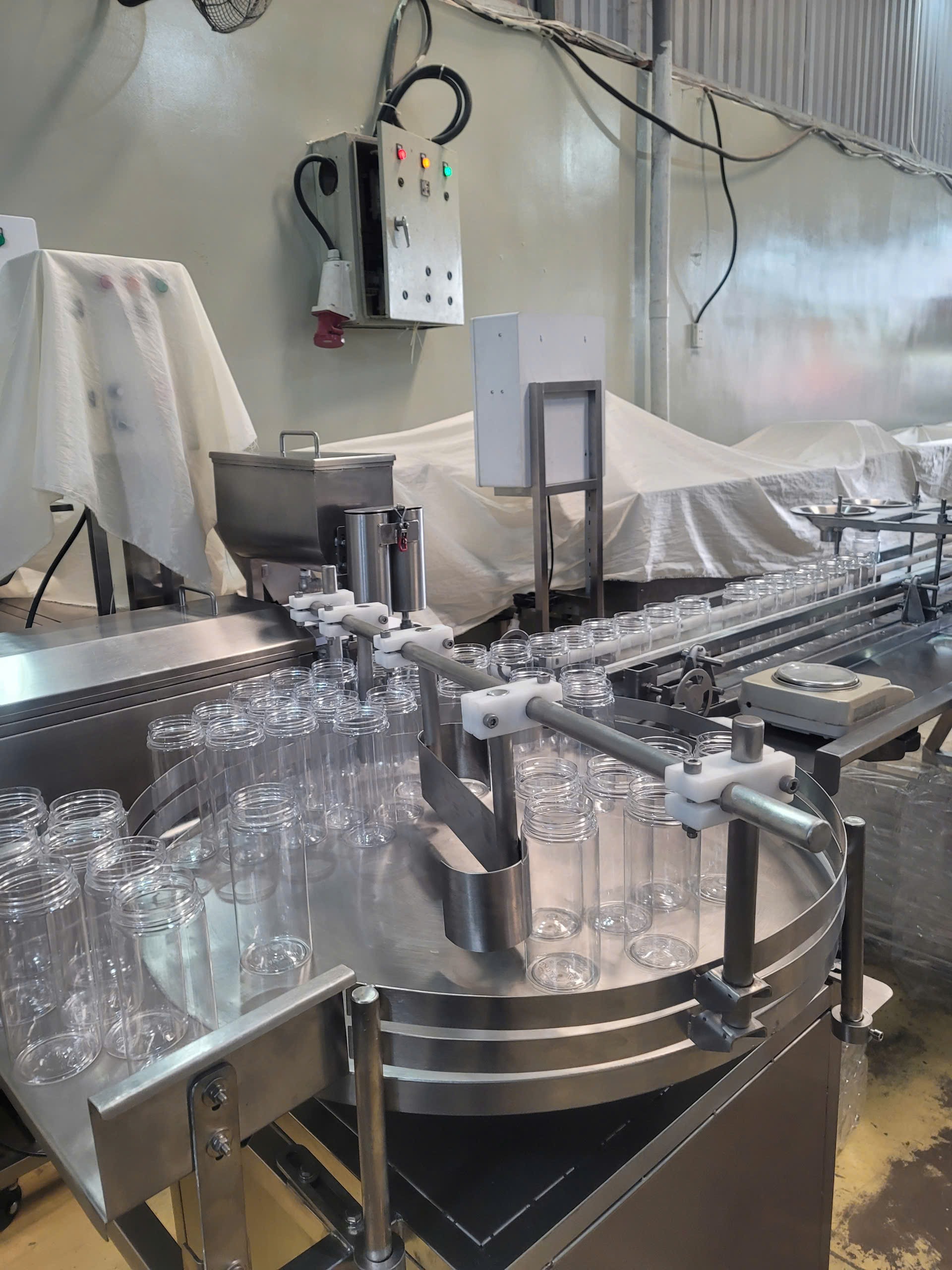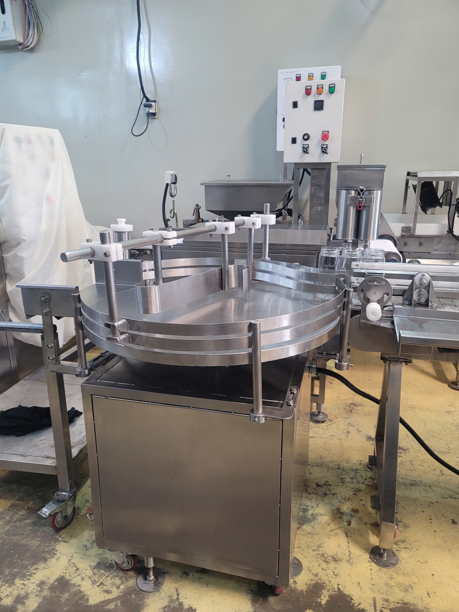 The rotary table automatically guides and directs jars onto the conveyor belt, leading them through the filling area.