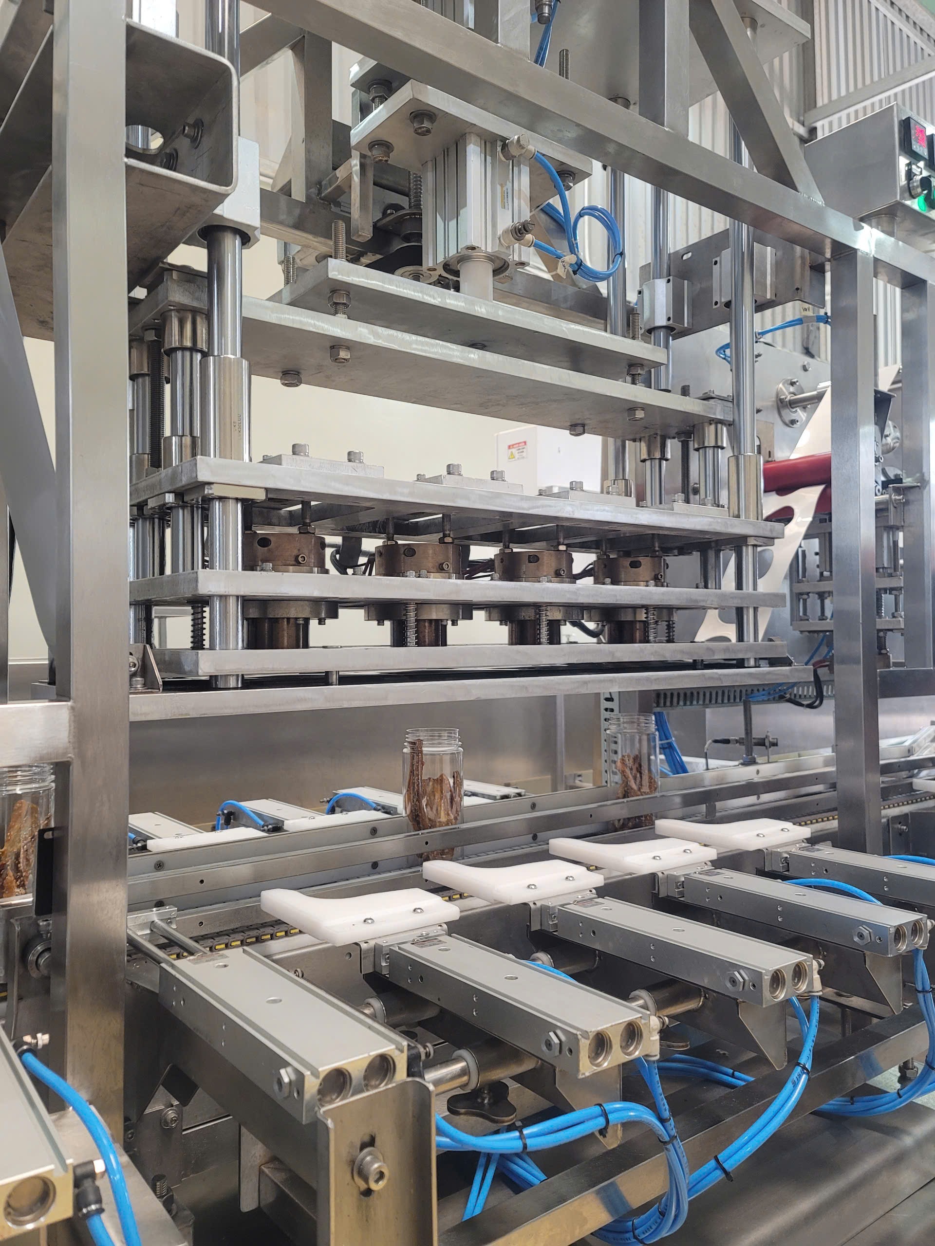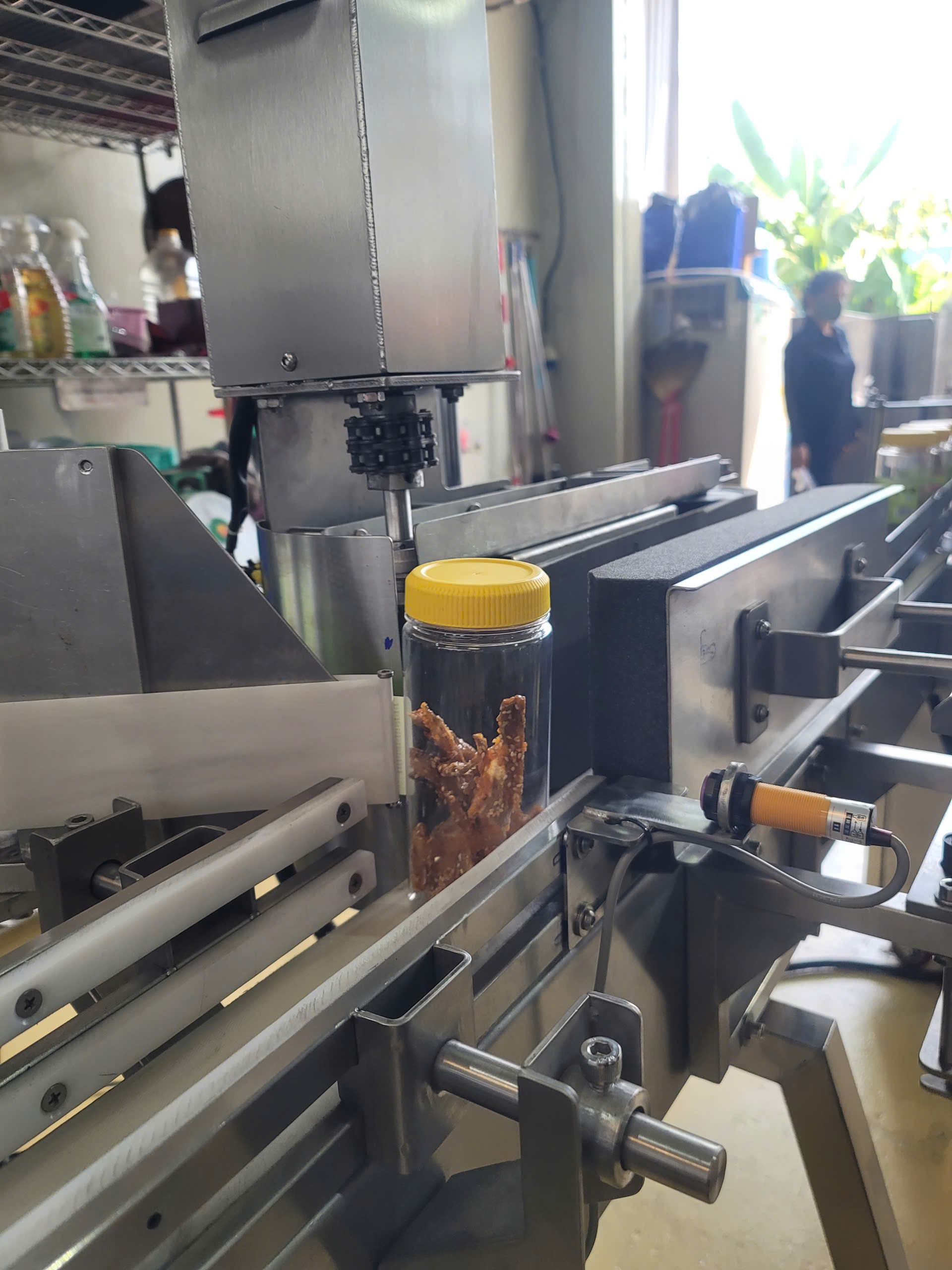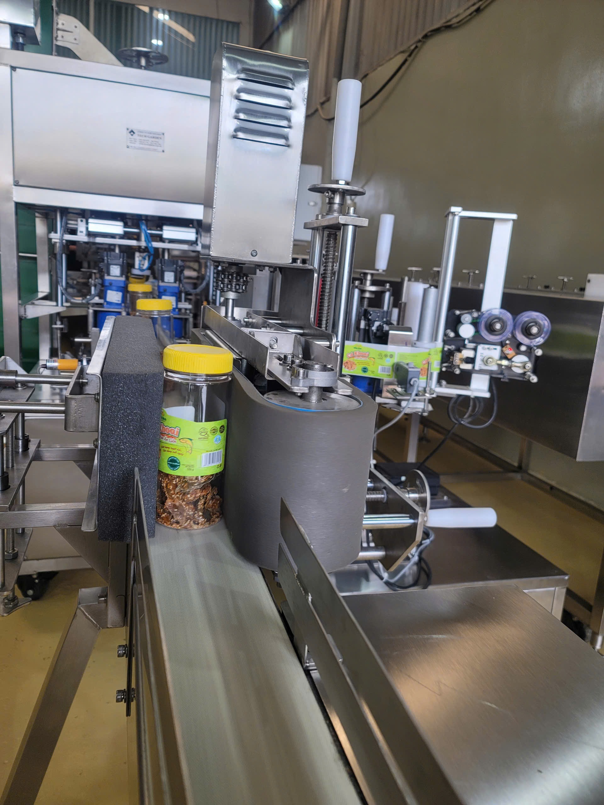 ⭐ 2.2. Automatic Sealing Machine: Seal feeder, jar detection sensor, and heat sealing system.